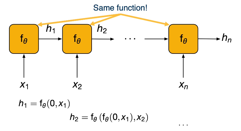Notice that the same weight matrix (represented as $\theta$ above) is used to transform our input, regardless of time step. This implies that RNNs make use of parameter sharing.