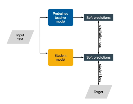 Knowledge Distillation works slightly differently. It turns out that the best NLP models tend to be massive foundation models, which are pre-trained on a huge amount of data and have many parameters. If inference with the large model is computationally expensive, we can train some student model with a smaller number of parameters based on the predictions of the larger model.