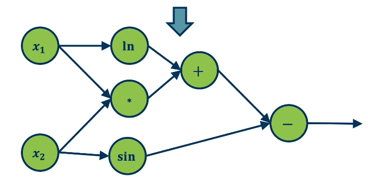 \[f(x_1, x_2) = \ln(x_1) + x_1x_2 - sin(x_2)\]The computation graph can be any directed acyclic graph (DAG), and individual operations within the graph must support differentiation. Mapping operations via a computation graph may seem trivial / excessive in the case of forward propagation, but it is an extremely useful structure for performing gradient descent across all layers within a neural network.