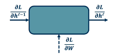 - Partial derivative of loss w.r.t. module input $\frac{\partial{L}}{\partial{h^{\ell - 1}}}$
