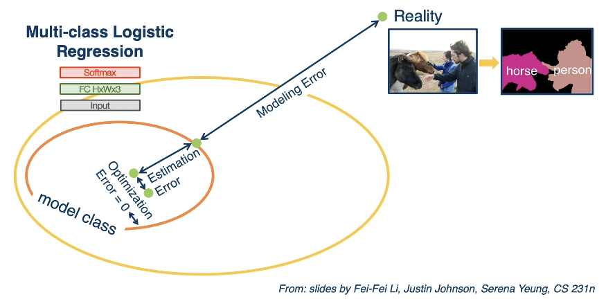- Modeling Error: hypothesis space for model class does not include the true target function.