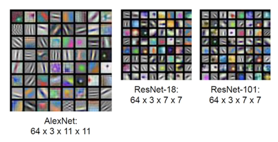 For any Convolutional Layer, we can visualize the kernel weights by scaling the weights to values from $[0, 255]$. Recall that weights are initialized to random values; the final learned weights might reveal insight into the structure of a particular learned feature extractor.