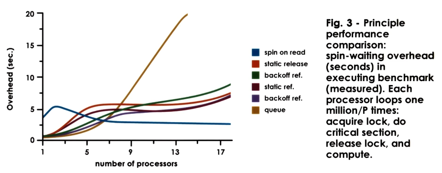 Finally, the Queuing Lock completely bypasses the issue of simultaneous test_and_set attempts by enforcing a queue structure. Once the lock frees, it signals the next task in the queue that the lock is available. This approach does have downsides - we must maintain $O(n)$ memory for the task queue, and have some read_and_increment atomic instruction to set queue status.