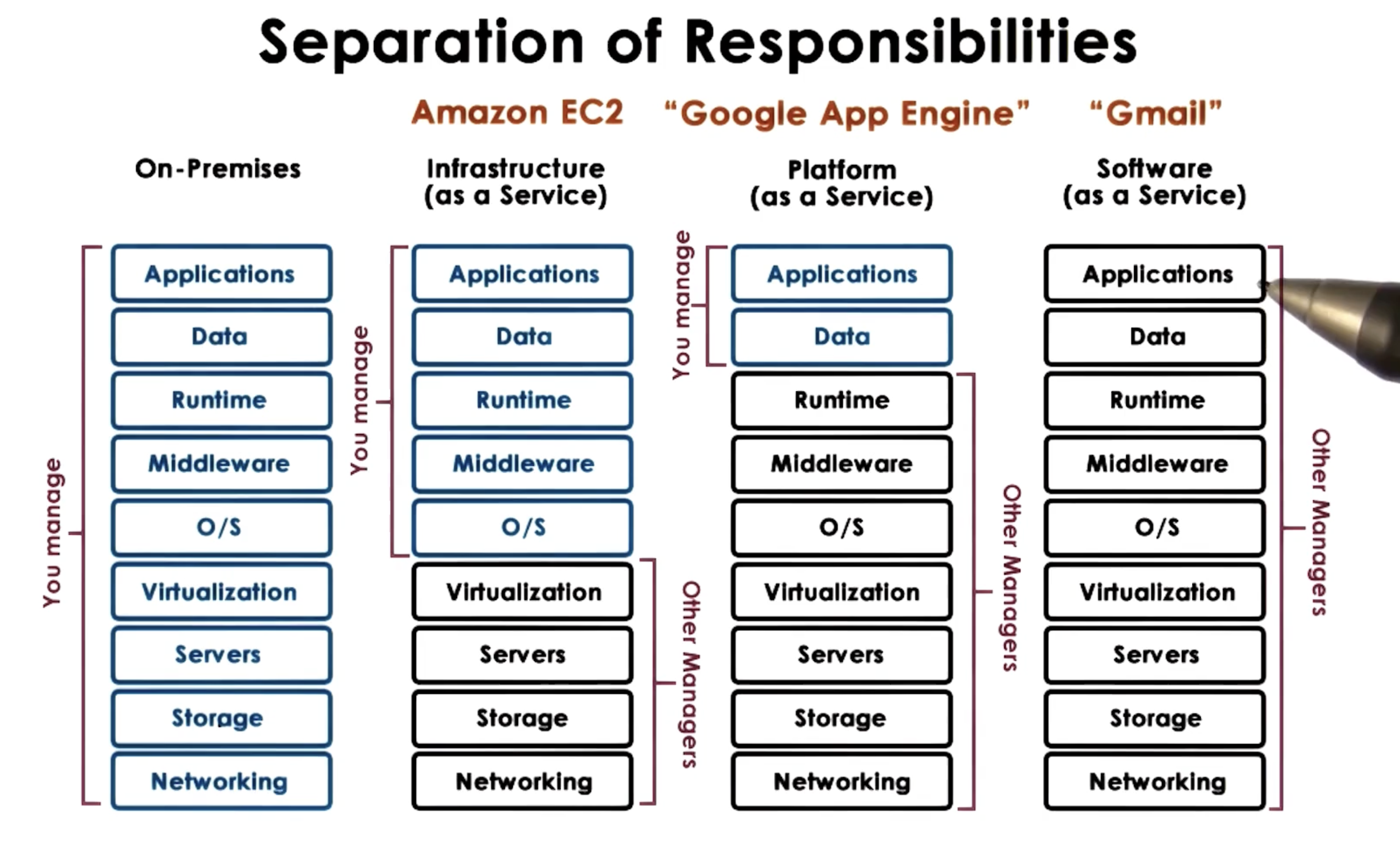 - Infrastructure-as-a-Service (IAAS): cloud provider manages physical aspects of the cloud services. Customer manages the application, data, and platform (runtime + OS).