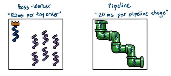 - Boss-Worker $\rightarrow$ 120 ms to process single order