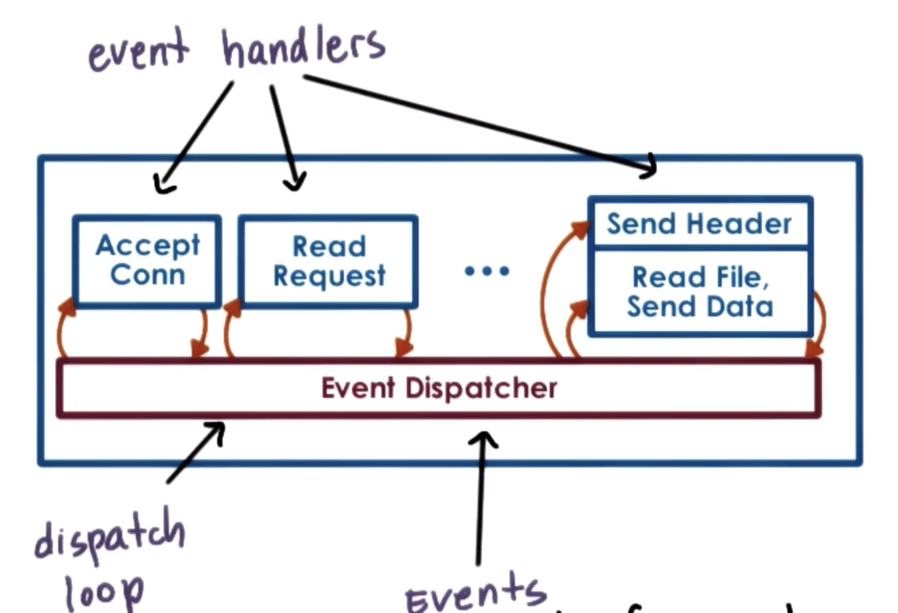- Non-Blocking I/O: when a request hits a slow operation (such as I/O), the server initiates the operation but does not wait. It instead switches to process the next request int he queue.
