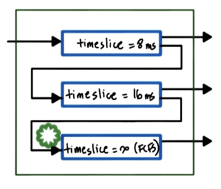 Furthermore, we can dynamically define timeslice values via some multi-level feedback queue, where each level of the queue corresponds to a particular timeslice value. If a task hits the timeslice limit without blocking, we bump it down to the next (longer) timeslice tier for its next iteration. Similarly, if the task does not exhaust its timeslice, it will be associated with a shorter timeslice tier in the next iteration.
