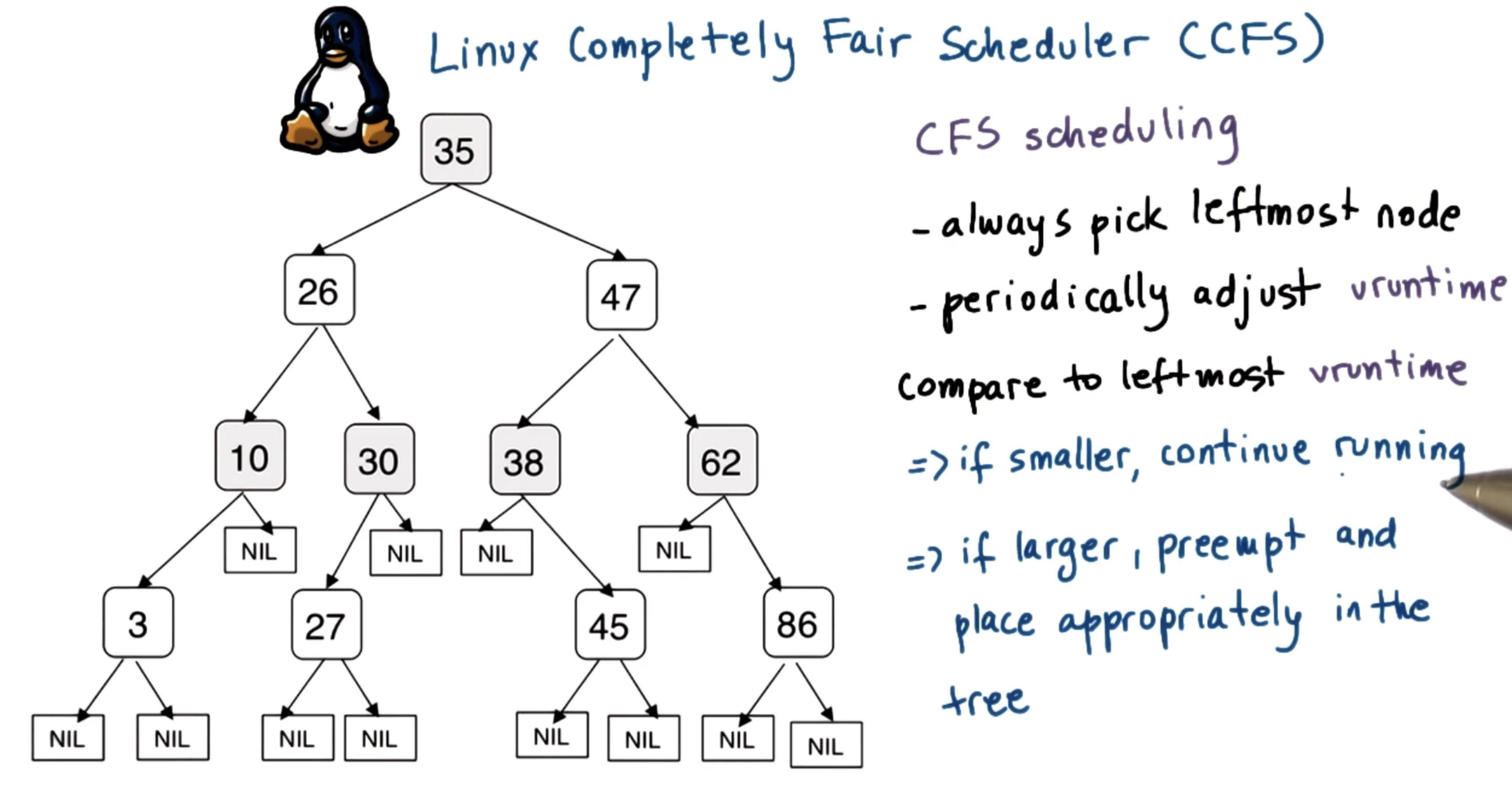 To resolve these issues, the Completely Fair Scheduler (CFS) was introduced. CFS is currently the default scheduler used in Linux. CFS uses a red-black tree as its runqueue structure; at its core, a red-black tree is a binary search tree with self-balancing after each node addition. CFS adds tasks to the tree based on virtual runtime, and always selects the leftmost node (least virtual runtime) at each scheduling step.