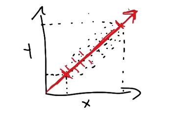 Consider the example below, where our original dataset consists of two features $\mathbf{x}$ and $\mathbf{y}$. The red line represents the first principal component, and maximizes the variance of the projected points.