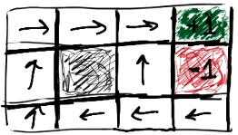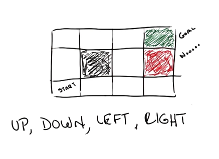The most basic example of reinforcement learning is Grid World. We are given an environment represented by a grid. The grid contains some starting state, goal state, and penalty state(s). An agent is placed into the environment at the starting state, and may select one of four actions: up, down, left, or right.
