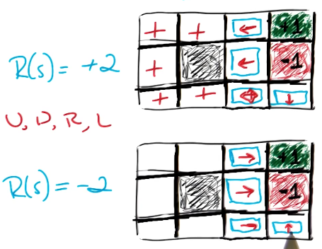 Furthermore, our definition of rewards has major impact on optimal policy. For example, if we redefine the reward for “other” states as part of our aforementioned Grid World problem, we see very different optimal policies.