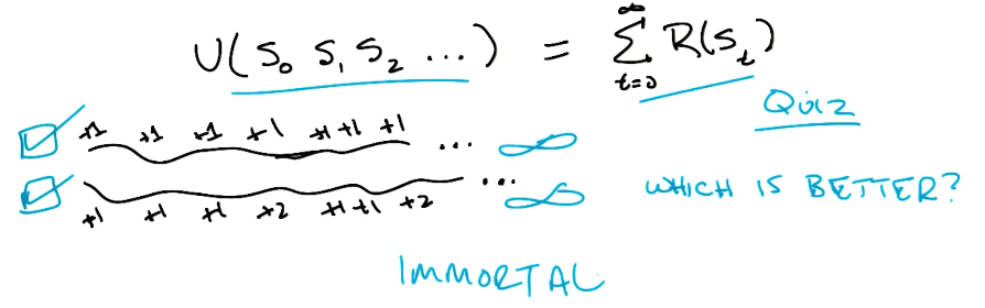 \[V(S_0, S_1, S_2, \ldots) = \sum_t R(S_t)\]The key problem with this representation is that, given infinite horizons and only positive reward, we will have infinite reward! In this case, we would not be able to compare two sequences.