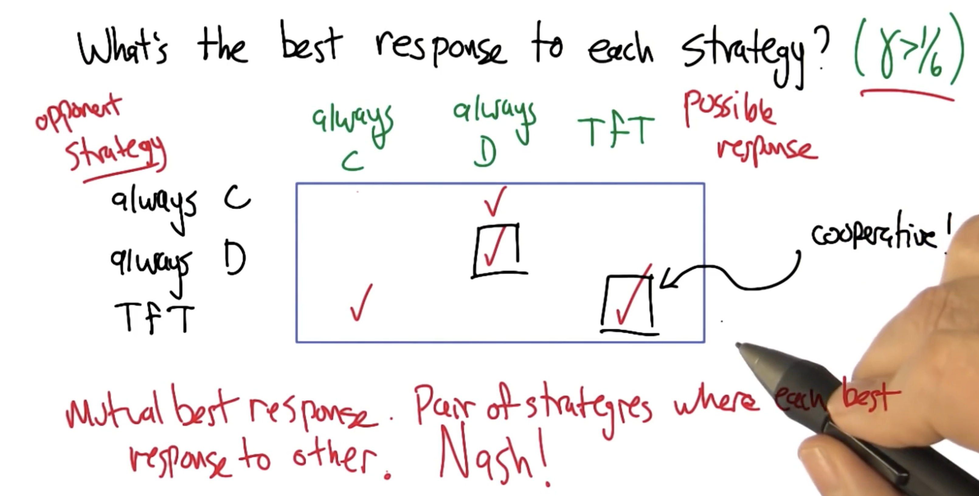 Interestingly, the optimal strategy in the iterated prisoner’s dilemma (IPD) is not to always defect. Instead, the strategy depends on 1) the specific value of termination $\gamma$, and 2) the opponent’s strategy.