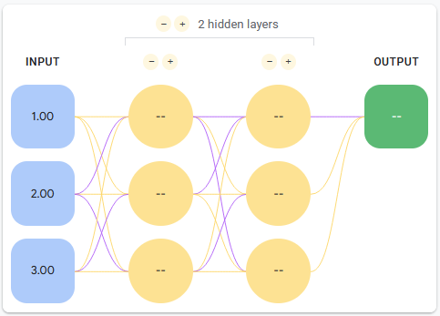 Neural networks are organized as a series of layers, which represent mathematical transformations. Nodes within the previous layer are the operands of the transformation, whereas those in the current layer are the result. Additionally, neural networks have an input layer with nodes representing features, and an output layer generating final results. For example, consider the following neural network with two hidden layers and three nodes per hidden layer.
