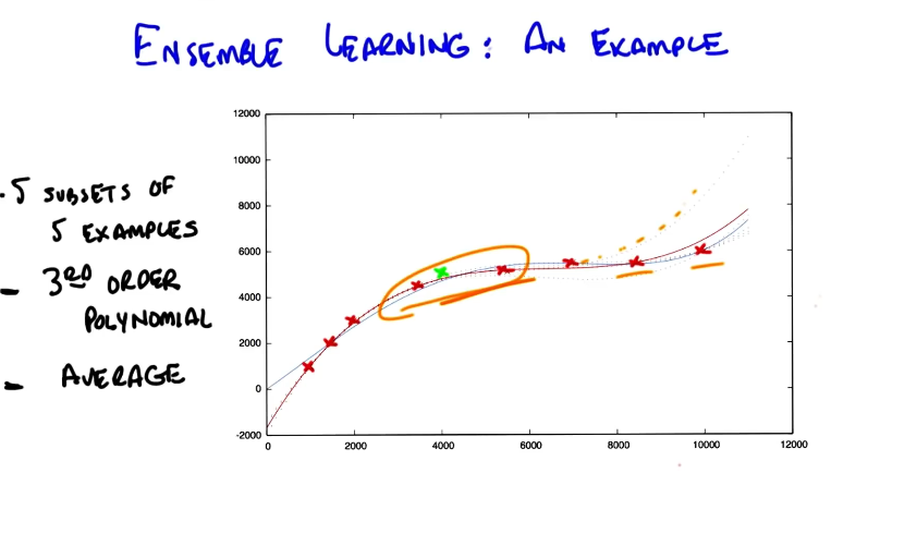 Consider the following algorithm for Bagging (bootstrap aggregation), which is the simplest application of ensemble learning. Bagging involves taking $k$ random samples (with replacement) from the original training dataset, then fitting a model to each sample.