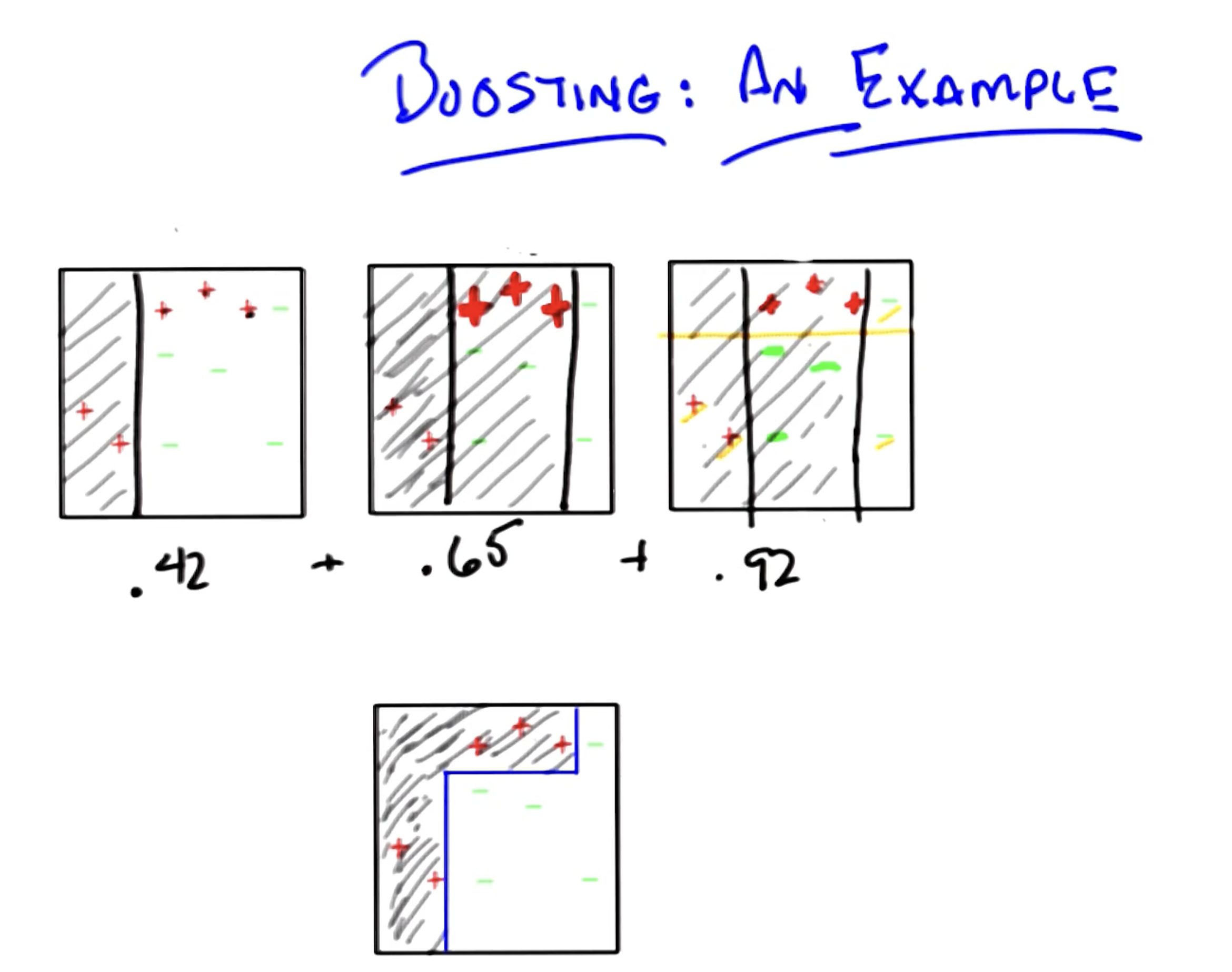 \[H(x) = \text{sign} \left ( \sum_{t=1}^{T}\alpha_t h_t(x) \right )\]To conclude boosting, consider the following illustrative example. We are dealing with binary classification ($+$ or $-$), and may only use axis-aligned semi-planes to represent decision boundaries (i.e., hypotheses).