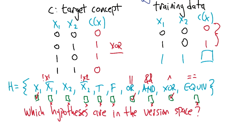 \[\text{GIVEN}: ~~~ c \in H ~~~ h \in H ~~~ S \in X ~~~ c(x) \forall x \in S\] \[\text{VERSION SPACE}: ~~~ VS(S) = \begin{Bmatrix} h ~~ \text{s.t.} ~ h \in H ~ \text{consistent with } S \end{Bmatrix}\]To be a member of the version space, the hypothesis should simply be consistent with the observed data. Consider the following example: