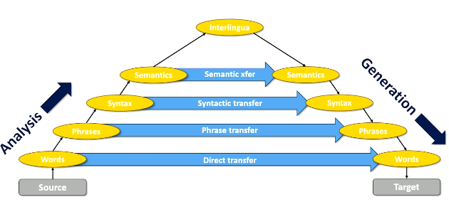 So how can we get from a source to target language? We can still get to some intermediate form via analysis, then get to our target via generation. More formally, this process is represented by the Vauquois Triangle. Although we cannot reach the perfect interlingua, we can select some level of analysis to serve as a “shortcut” for jumping from source to target.