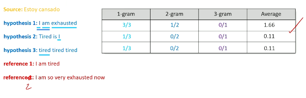 - Given predicted and reference translations, we compute the ratio of n-gram appearances in predicted versus reference. This is repeated for all possible n-grams.