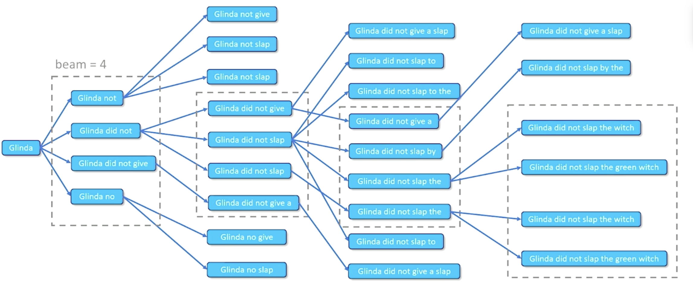 What happens when we have massive phrase lattice tables, and computational demand becomes infeasible? Beam Search reduces our search space by maintaining a fixed number of paths $k$ - more specifically, the top $k$ scoring options - at each step forward in sequence generation.