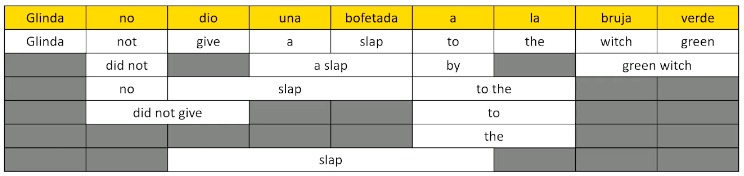 - We can construct a phrase lattice to represent all possible combinations of phrase vs. direct word translations. Note that the phrase lattice contains the results of direct transfer as the first row, then possible alternative phrase translations in subsequent rows.