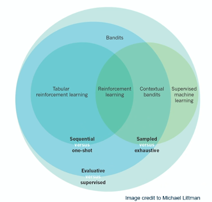 - Evaluative: reward is relative to the agent. Algorithm must balance between gathering and utilization of information (exploration vs. exploitation, respectively).